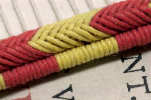 En la imagen un acercamiento a una cabezada griega a chevron. El esquema pertenece al manual por excelencia en este tema “Tranchefiles Brodées” editado en