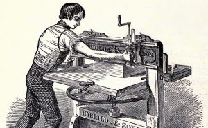 William Burn inventa la prensa de laminación, la primera máquina utilizada en encuadernación, reemplaza la antigua operación de batido de los cuadernillos cuyo propósito es reducir el grosor de los cuadernillos.